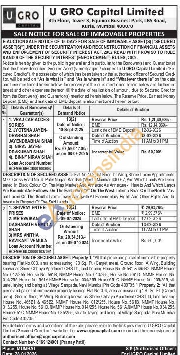 DESCRIPTION OF SECURED ASSET: Property 1: "All that piece and parcel of immovable property bearing Flat No.003, area admeasuring 170 Sq. Ft. (Carpet area), Ground floor, 'A Wing, Building known as Shree Chhaya Apartment CHS Lid, land bearing House No. 46581 & 46582, NMMP House No. 012/255, House No. 561B, NMMP House No. 013/255, House No. 561D, NMMP House No. 014/255, House No. 561A,NMMP House No. 034/255, House651C, NMMP House No. 035/255, sit-uate, laying and being at Village Sanpada, Navi Mumbai Pin Code 400705. Property 2: "All that piece and parcel of immovable property bearing Flat No.004, area admeasuring 170 Sq. FL (Carpet area), Ground floor, 'A' Wing, Building known as Shree Chhaya Apartment CHS Ltd, land bearing Hause No. 465B1 & 465B2, NMMP House No. 012/255, House No. 561B, NMMP House No. 013/255, House No. 561D, NMMP House No. 014/255, House No. 561A,NMMP House No. 034/255, House651 C. NMMP House No. 035/255, situate, laying and being at Village Sampada, Navi Mumbai Pin Code 400705."
