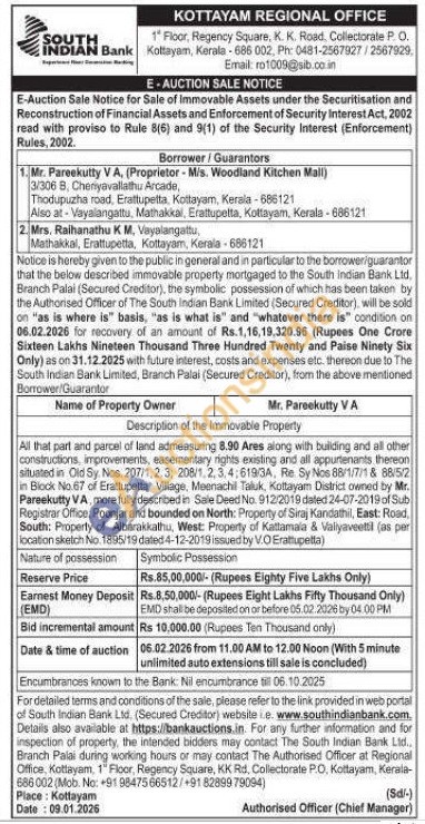 All that part and parcel of land admeasuring 8.90 Ares along with building and all other constructions, improvements, easementary rights existing and all appurtenants thereon situated in Old Sy. Nos. 207/1,2,3, 208/1,2,3,4:619/3A, Re Sy Nos 88/1/7/1 & 88/5/2 in Block No.67 of Erattupetta Village, Meenachil Taluk, Kottayam District owned by Mr. Pareekutty VA, more fully described in Sale Deed No. 912/2019 dated 24-07-2019 of Sub Registrar Office, Poonjar and bounded on North: Property of Siraj Kandathil, East: Road, South: Properly of Albarakkathu, West: Property of Katlamala & Valiyaveettil (as per location sketch No. 1895/19 dated4-12-2019 issued by V.O Erattupelta)