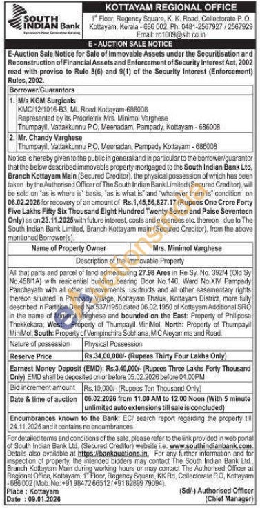 All that parts and parcel of land admeasuring 27.98 Ares in Re Sy. No. 392/4 (Old Sy No.458/1A) with residential building bearing Door No. 140, Ward No.XIV Pampady Panchayath with all other improvements, usufructs and all other easementary rights thereon situated in Pampady Village, Kottayam Thaluk, Kottayam District, more fully described in Partition Deed No 537/1950 dated 06.02.1950 of Kottayam Additional SRO in the name of Minimol Varghese and bounded on the East: Property of Philipose Thekkekara, West: Property of Thumpayil MiniMol; North: Property of Thumpayil MiniMol: South: Property of Vempinchira Sobhana, MCAleyamma and Road