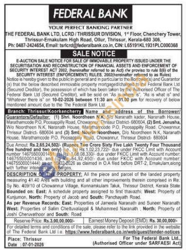 All the piece and parcel of the landed property measuring 41.40 Ares with building and all other improvements therein comprised in Re Sy No. 409/10 of Chowannur Village, Kunnamkulam Taluk, Thrissur District, Kerala State Bounded on: East: A schedule property assigned to first thavazhi: West: Property of Kunjumon, North: Property of Jacob and South: Panchayath Road. As per Revenue Records: East: Properties of Jameela Naranath and Suneer Naranath West: Properties of Salim Cheltuvalappil & Muhammed Naranath, North: Property of Joshi Cheruvathoor and South: Road