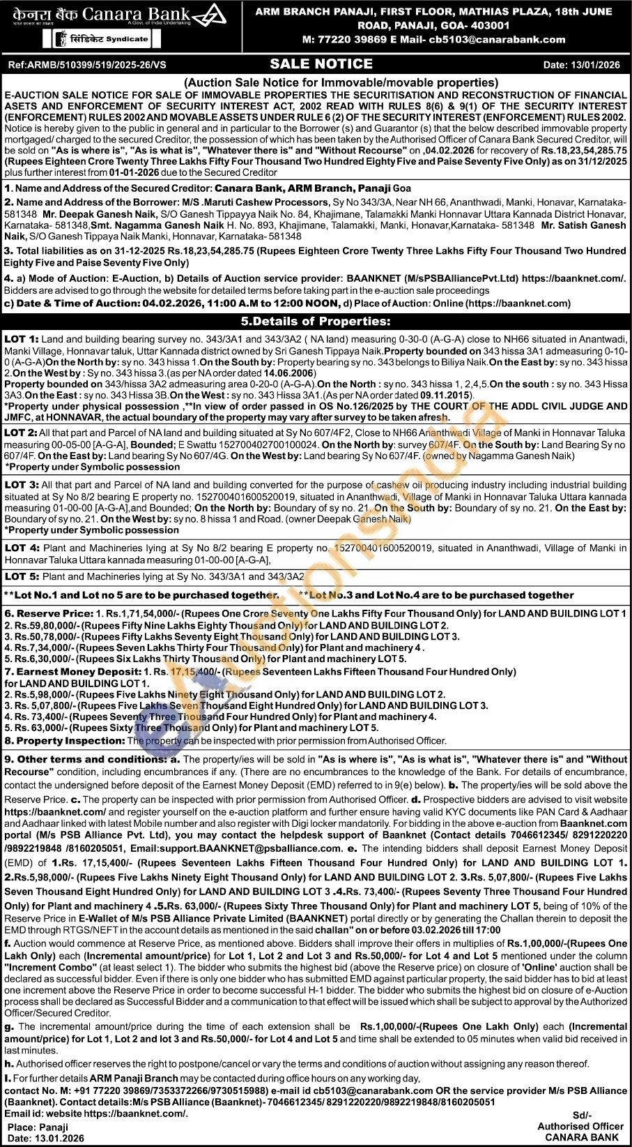 LOT 4: Plant and Machineries lying at Sy No 8/2 bearing E property no. 152700401600520019, situated in Ananthwadi, Village of Manki in Honnavar Taluka Uttara kannada measuring 01-00-00 [A-G-A)