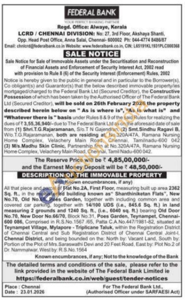 All that piece and parcel of Flat No.2A, First Floor, measuring built up area 2362 Sq. ft., in the multistoried building known as Shanthiniketan Flats", New No.70. Old No.66, Poes Garden, together with including common area and covered car parking, together with 14/100 UDS (ie, 845.6 Sq. ft.) in land measuring 2 grounds and 1240 Sq. ft., (ie, 6040 sq. ft.) bearing Old Door No.70, New Door No.66/70, Block No.31, Poes Garden, Teynampet, Chennai-600 086, Comprised in R.S.No.1567/65, Patta C.A.No.447/1981-82, situated at Teynampet Village, Mylapore Triplicane Taluk, within the Registration District of Chennai Central and Sub Registration District of Chennai Central Joint-Chennai District, and being bounded on the North by: Vacant Land, South by: Portion of the Plot of Mrs. Saraswathi Devi and 20 Feet Road, East by: Plot No.2 of Dr. Nammalwar, Westby: RS No. 1564