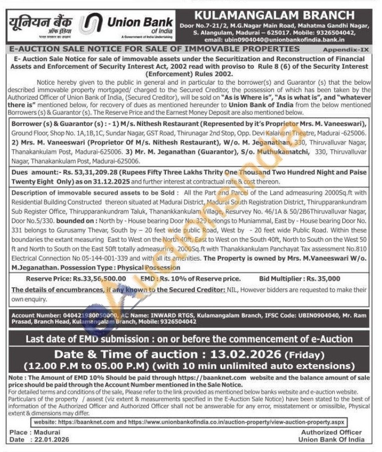 Description of immovable secured assets to be Sold: All the Part and Parcel of the Land admeasuring 2000Sq.ft with Residential Building Constructed thereon situated at Madurai District, Madurai South Registration District, Thirupparankundram Sub Register Office, Thirupparankundram Taluk, Thanankkankulam Village, Resurvey No. 46/1A & 50/286Thiruvalluvar Nagar, Door No.5/330, bounded on: North by - House bearing Door No. 329 belongs to Muniammal, East by - House bearing Door No. 331 belongs to Gurusamy Thevar, South by 20 feet wide public Road, West by 20 feet wide Public Road. Within these boundaries the extant measuring East to West on the North 40ft, East to West on the South 40ft, North to South on the West 50 ft and North to South on the East 50ft totally admeasuring 2000Sq.ft with Thanakkankulam Panchayat Tax assessment No.810 Electrical Connection No 05-144-001-339 and with all its amenities. The Property is owned by Mrs. M.Vaneeswari W/o. M.Jeganathan. Possession Type: Physical Possession