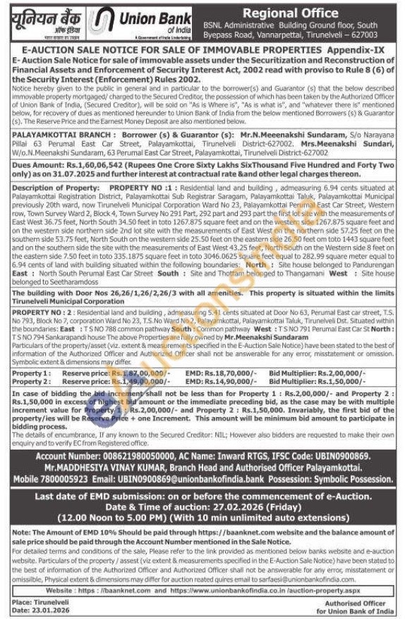 PROPERTY NO: 2: Residential land and building, admeasuring 5.41 cents situated at Door No 63, Perumal East car street, T.S. No 793, Block No 7, corporation Ward No 23, T.S.No Ward No 2, Palayamkottal, Palayamkottai Taluk, Tirunelveli Dst. Situated within the boundaries: East TS NO 788 common pathway South: Common pathway West: TSNO 791 Perumal East Car St North: TSNO 794 Sankarapandi house The above Properties are fully owned by Mr.Meenakshi Sundaram Particulars of the property/asset (viz. extent & measurements specified in the E-Auction Sale Notice) have been stated to the best of information of the Authorized Officer and Authorized Officer shall not be answerable for any error, misstatement or omission. Symbolic extent & dimensions may differ