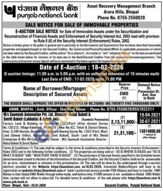 Factory Land & Building on Survey No.120/2(Part) (After division Survey No.120/2/2), Village Kalukhedi, PH.No. 19 (New No.42), Tehsil & District-Dewas, Area: 0.346 Hectare, Boundaries: East-Land Bearing Survey No. 120/2 (Part), West-Land (Dewas Utility), North Govt. Land (Kakad), South Land of Mis Shetal Enterprises & Mis Nil-Cool, Property Owner: Mis Saumyah Automation Director Nakul Baheti & Smriti Baheti