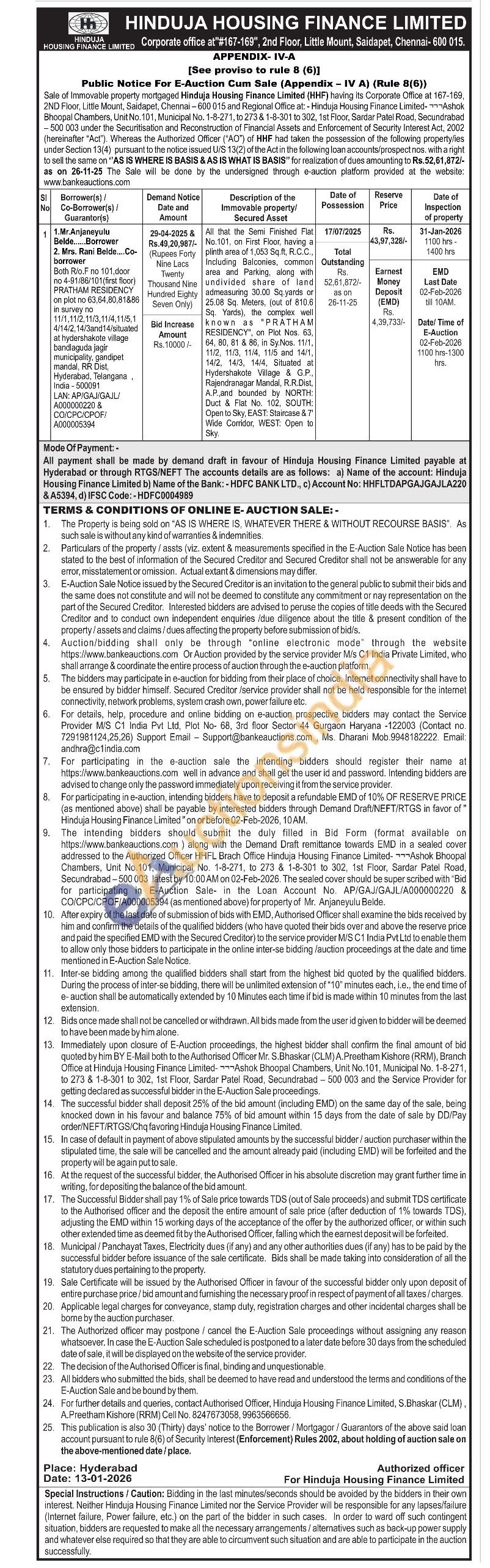 contact Authorised Officer, Hinduja Housing Finance Limited, S.Bhaskar (CLM), A.Preetham Kishore (RRM) Cell No. 8247673058, 9963566656