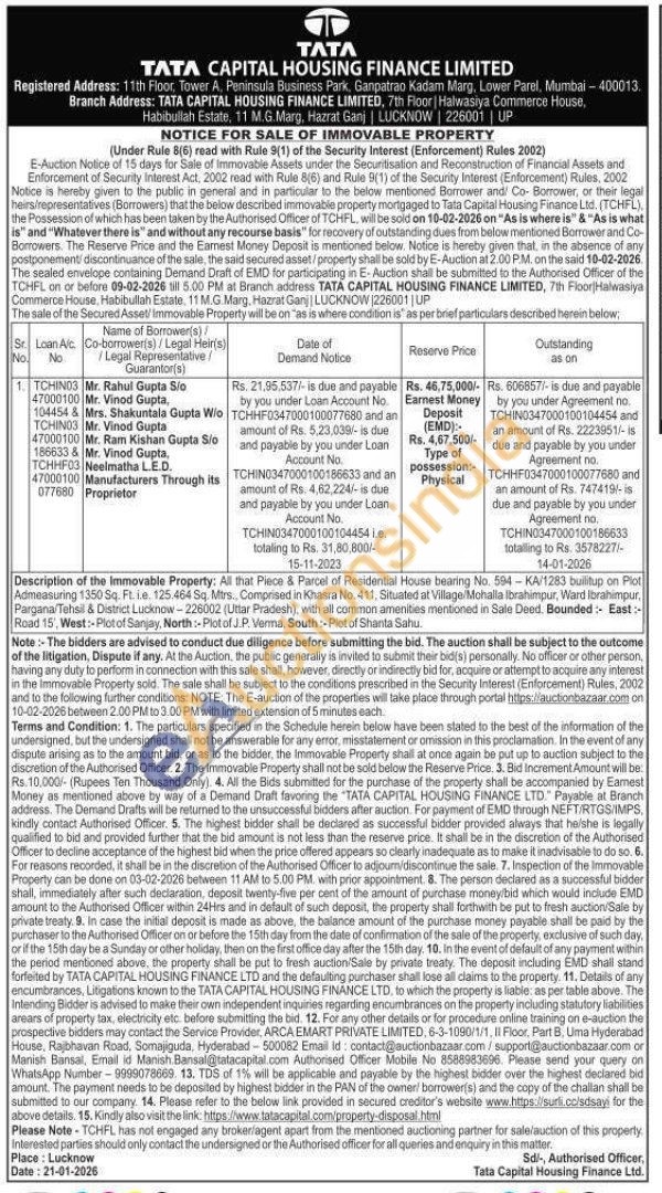 Description of the Immovable Property: All that Piece & Parcel of Residential House bearing No. 594-KA/1283 bullitup on Plot Admeasuring 1350 Sq. Ft. i.e. 125.464 Sq. Mtrs., Comprised in Khasra No. 411, Situated at Village/Mohalla Ibrahimpur, Ward Ibrahimpur, Pargana/Tehsil & District Lucknow-226002 (Uttar Pradesh), with all common amenities mentioned in Sale Deed. Bounded: East:-Road 15', West:-Plot of Sanjay, North :-Plot of J.P. Verma, South:-Plot of Shanta Sahu.
