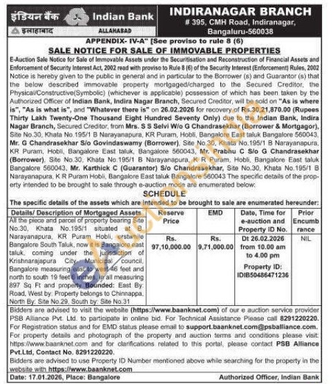 All the piece and parcel of property bearing Site No.30, Khata No.195/1 situated at B. Narayanapura, KR Puram Hobli, erstwhile Bangalore South Taluk, now it is Bangalore Gast taluk coming under the jurisdiction of Krishnarajapura City Municipal council, Bangalore measuring east to west 46 feet and north to south 19 feet 6 inches, in all measuring 897 Sq Ft and property Bounded: East By: Road, West by: Property belongs to Chinnappa, North By: Site No.29, South by: Site No.31
