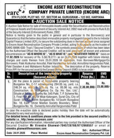 All the piece & parcel of Immovable property bearing Bungalow No. C-17 admeasuring 294.05 sq. yard. Le 246.24 sq. mts, & 925 sq. fts. le. 85.96 sq. mts. Construction, in "Pushpakunj Co. Op. Ha. Sec. Ltd." Situate at Revenue Survey No. 545 Paiki, T. P. Scheme No. 3. Final Plot No. 16. of Moje Katargam, Surat City, City of Surat-395008 North: Bungalow No. 14 South Bungalow No. 18, East: Shree Niketan Society Boundary, West: Bungalow No. 16. Owned by Amrutial Hargovindas Patel
