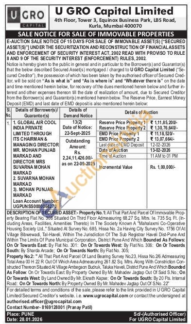 DESCRIPTION OF SECURED ASSET:- Property No. 1: All That Part And Parcel Of Immovable Prop-erty Bearing Flat No. 308 Situated On Third Floor Admeasuring 68.27 Sq. Mrs. le. 735 Sq. Ft. (In-duding Areas, Facilities, Amenities Thereto) In The Society Known A "Mahalaxmi Co-Operative Housing Society Ltd.," Situated At Survey No. 685, Hissa No. 2a Having City Survey No. 1756. Of Al Village Bbwewadi, Tal-Haveli, Within The Jurisdiction Of The Sub Registrar Haveli Dist-Pune And Within The Limits Of Pune Municipal Corporation, District Pune And Which Bounded As Follows: On Or Towards East: By Flat No. 301: On Or Towards West: By Flat No. 306: On Or Towards South: By Sharda Arcade; On Or Towards North: By Flat No. 305,