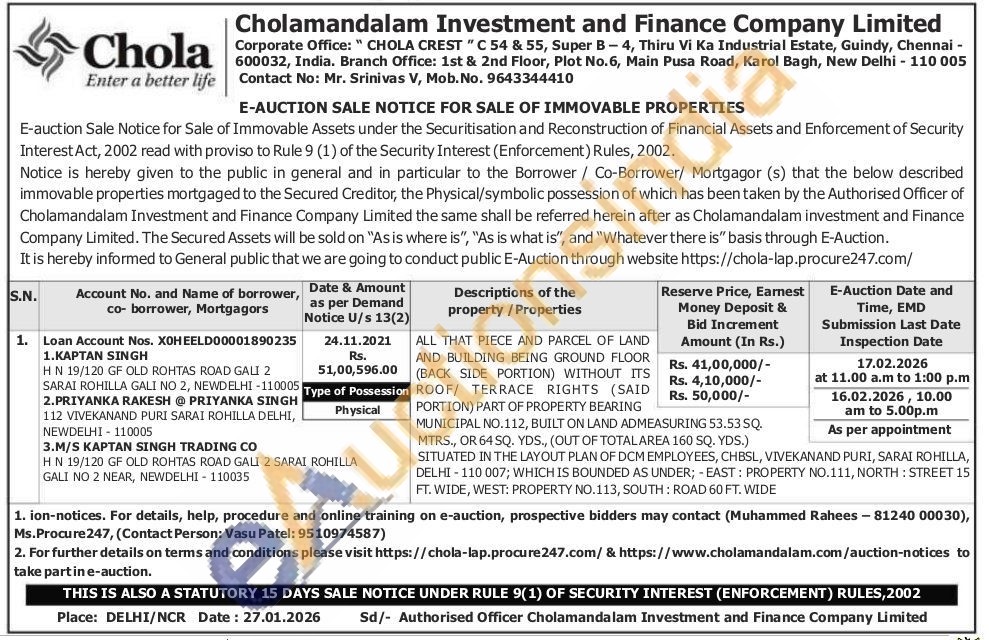 ALL THAT PIECE AND PARCEL OF LAND AND BUILDING BEING GROUND FLOOR (BACK SIDE PORTION) WITHOUT ITS ROOF/ TERRACE RIGHTS (SAID PORTION) PART OF PROPERTY BEARING MUNICIPAL NO.112, BUILT ON LAND ADMEASURING 53.53 SQ. MTRS., OR 64 SQ. YDS., (OUT OF TOTALAREA 160 SQ. YDS.) SITUATED IN THE LAYOUT PLAN OF DCM EMPLOYEES, CHBSL, VIVEKANAND PURI, SARAI ROHILLA, DELHI-110 007; WHICH IS BOUNDED AS UNDER; EAST: PROPERTY NO.111, NORTH: STREET 15 FT. WIDE, WEST: PROPERTY NO.113, SOUTH: ROAD 60 FT. WIDE