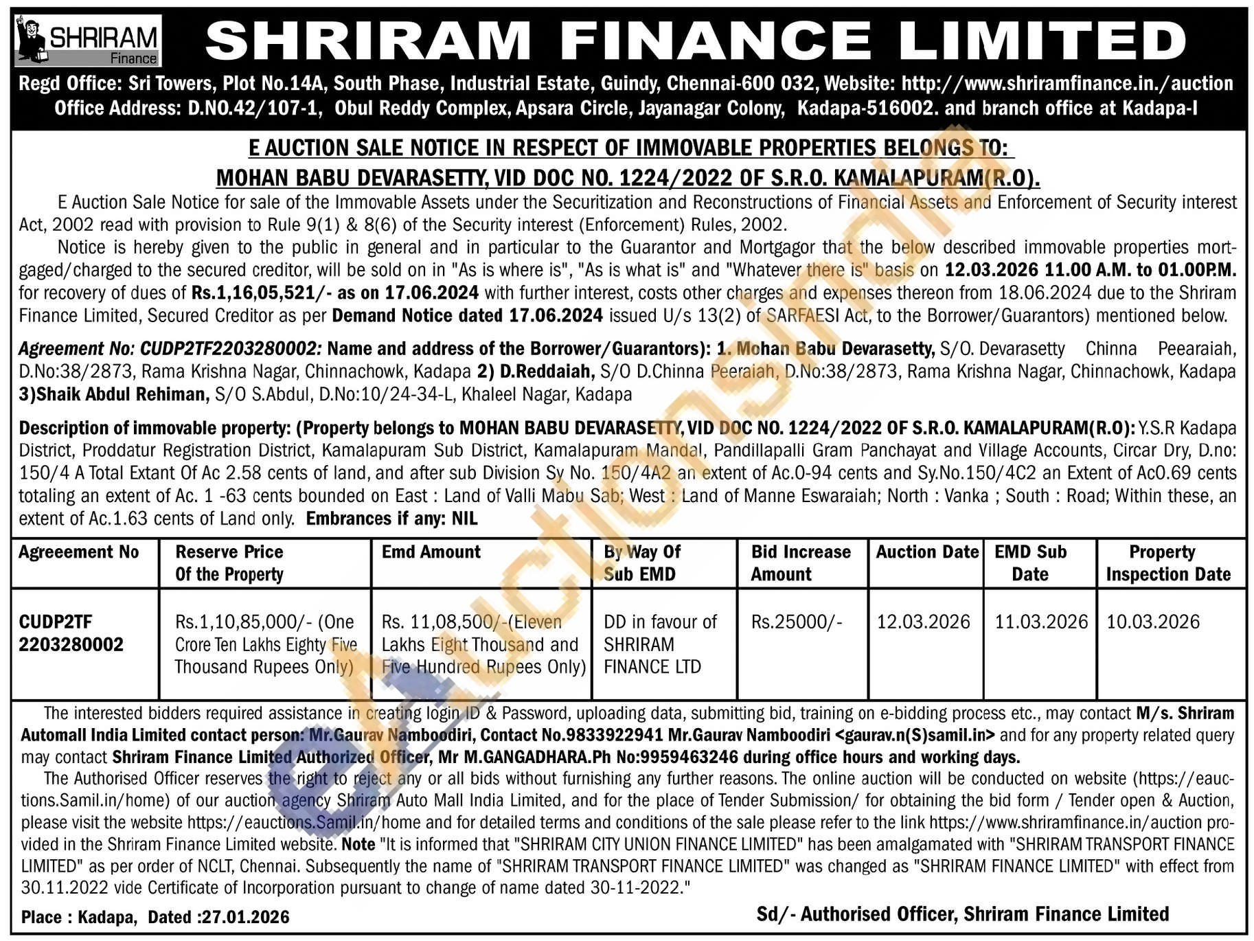 Description of immovable property: (Property belongs to MOHAN BABU DEVARASETTY, VID DOC NO. 1224/2022 OF S.R.O. KAMALAPURAM (R.O): Y.S.R Kadapa District, Proddatur Registration District, Kamalapuram Sub District, Kamalapuram Mandal, Pandillapalli Gram Panchayat and Village Accounts, Circar Dry, D.no: 150/4 A Total Extant Of Ac 2.58 cents of land, and after sub Division Sy No. 150/4A2 an extent of Ac.0-94 cents and Sy.No.150/4C2 an Extent of Ac0.69 cents totaling an extent of Ac. 1-63 cents bounded on East: Land of Valli Mabu Sab; West: Land of Manne Eswaraiah; North Vanka; South Road; Within these, an extent of Ac. 1.63 cents of Land only