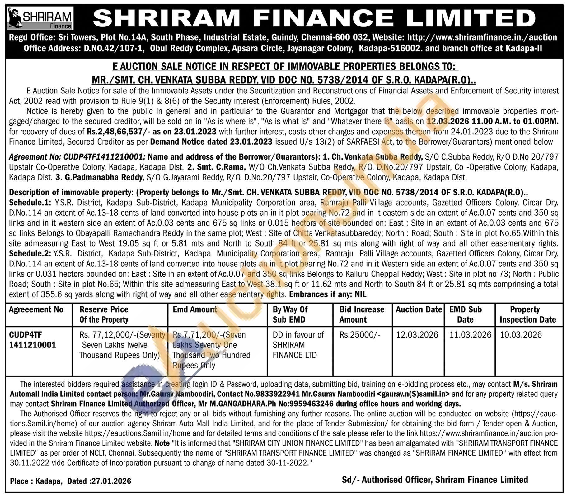 Description of immovable property: (Property belongs to Mr./Smt. CH. VENKATA SUBBA REDDY, VID DOC NO. 5738/2014 OF S.R.O. KADAPA(R.O).. Schedule.1: Y.S.R. District, Kadapa Sub-District, Kadapa Municipality Corporation area, Ramraju Palli Village accounts, Gazetted Officers Colony, Circar Dry. D.No.114 an extent of Ac. 13-18 cents of land converted into house plots an in it plot bearing No.72 and in it eastern side an extent of Ac.0.07 cents and 350 sq links and in it western side an extent of Ac.0.03 cents and 675 sq links or 0.015 hectors of site bounded on: East: Site in an extent of Ac.0.03 cents and 675 sq links Belongs to Obayapalli Ramachandra Reddy in the same plot; West: Site of Chitta Venkatasubbareddy; North: Road; South: Site in plot No.65, Within this site admeasuring East to West 19.05 sq ft or 5.81 mts and North to South 84 ft or 25.81 sq mts along with right of way and all other easementary rights. Schedule.2: Y.S.R. District, Kadapa Sub-District, Kadapa Municipality Corporation area, Ramraju Palli Village accounts, Gazetted Officers Colony, Circar Dry. D.No.114 an extent of Ac. 13-18 cents of land converted into house plots an in it plot bearing No.72 and in it Western side an extent of Ac.0.07 cents and 350 sq links or 0.031 hectors bounded on: East: Site in an extent of Ac.0.07 and 350 sq links Belongs to Kalluru Cheppal Reddy; West: Site in plot no 73; North: Public Road; South: Site in plot No.65; Within this site admeasuring East to West 38.1 sq ft or 11.62 mts and North to South 84 ft or 25.81 sq mts comprinsing a total extent of 355.6 sq yards along with right of way and all other easementary rights