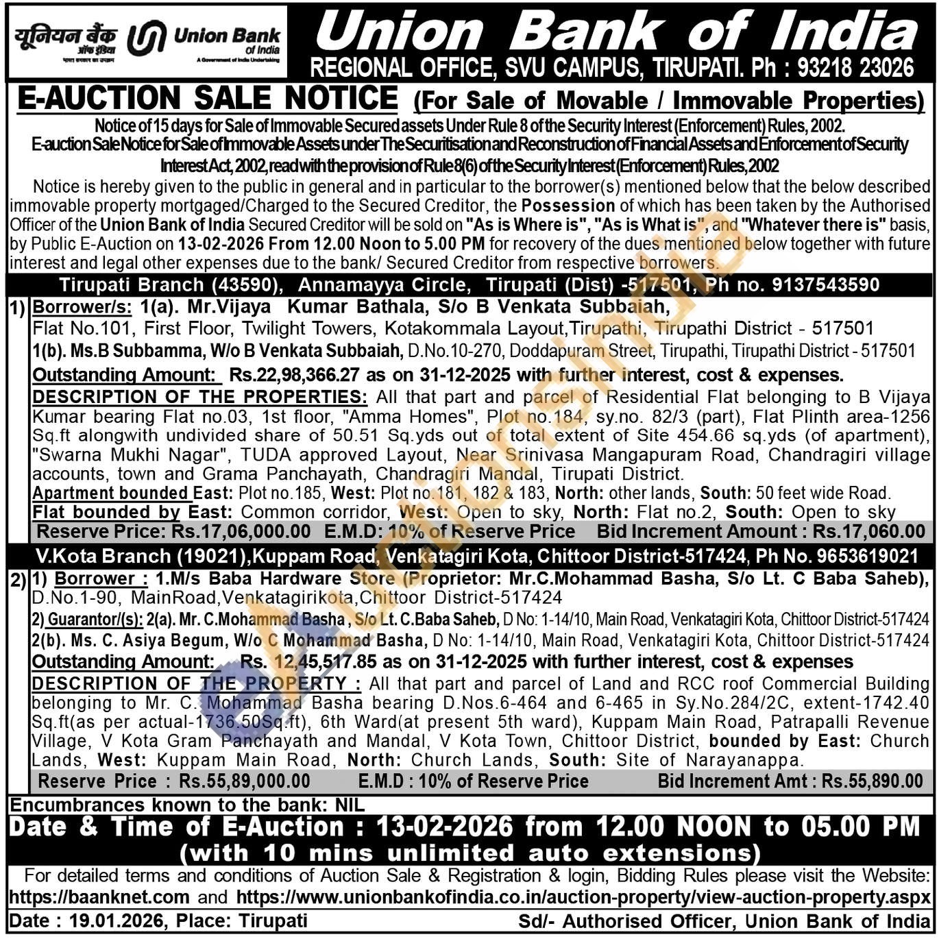 All that part and parcel of Residential Flat belonging to B Vijaya Kumar bearing Flat no.03, 1st floor, "Amma Homes", Plot no.184, sy.no. 82/3 (part), Flat Plinth area-1256 Sq.ft alongwith undivided share of 50.51 Sq.yds out of total extent of Site 454.66 sq.yds (of apartment), "Swarna Mukhi Nagar", TUDA approved Layout, Near Srinivasa Mangapuram Road, Chandragiri village accounts, town and Grama Panchayath, Chandragiri Mandal, Tirupati District