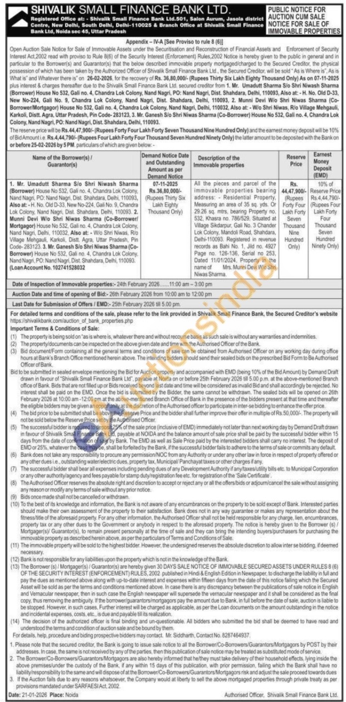 All the pieces and parcel of the immovable properties bearing address: Residential Property, Measuring an area of 35 sq. yds. Or 29.26 sq. mtrs, bearing Property no. 532, Khasra no. 786/529, Situated at Village Sikdarpur, Gali No. 3 Chander Lok Colony, Mandoli Road, Shahdara, Delhi-110093. Registered in revenue records as Bahi No. 1, Jild no, 4927 Page no. 126-136, Serial no 253, Dated 11/01/2024, Property in the name of Mrs. Munni Devi Wio Shri Niwas Sharma.