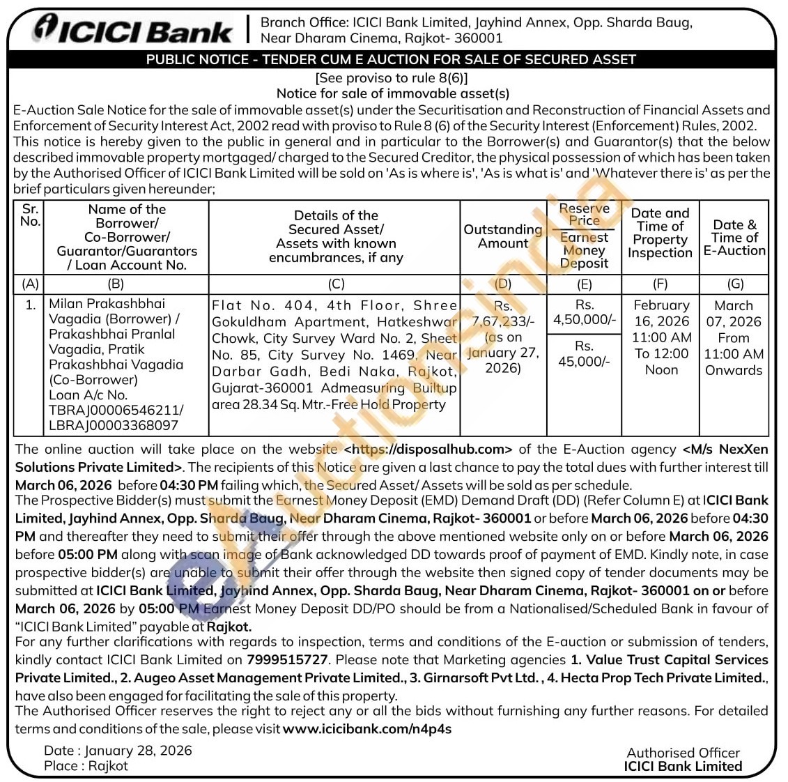 Flat No. 404, 4th Floor, Shree Gokuldham Apartment, Hatkeshwar Chowk, City Survey Ward No. 2, Sheet No. 85, City Survey No. 1469, Near Darbar Gadh, Bedi Naka, Rajkot, Gujarat-360001 Admeasuring Builtup area 28.34 Sq. Mtr.-Free Hold Property