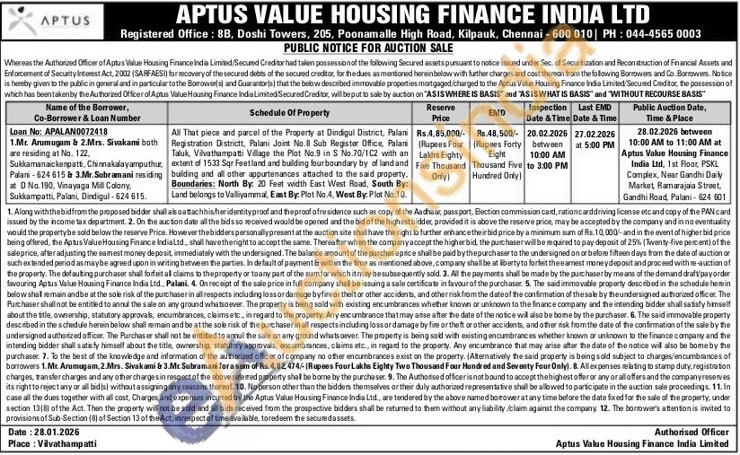 All That piece and parcel of the Property at Dindigul District, Palani Registration Districtt, Palani Joint No.Il Sub Register Office, Palani Taluk, Vilvathampatti Village the Plot No.9 in S No.70/1C2 with an extent of 1533 Sqr Feetland and building fourboundary by of land and building and all other appurtenances attached to the said property, Boundaries: North By: 20 Feet width East West Road, South By: Land belongs to Valliyammal, East By: Plot No.4, West By: Plot No.10