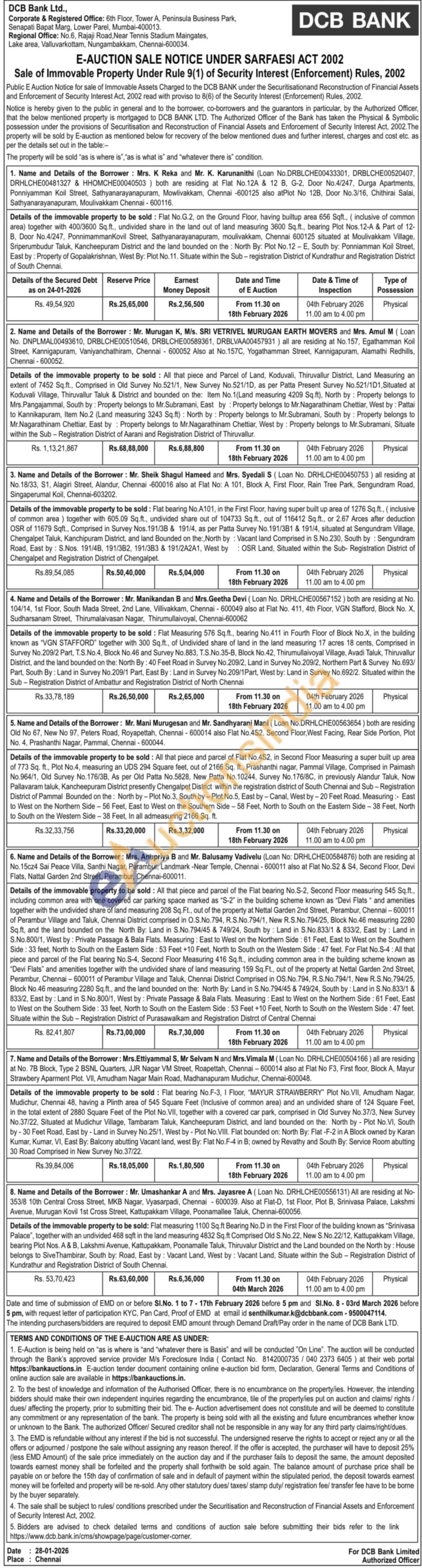Details of the immovable property to be sold: All that piece and parcel of the Flat bearing No.S-2, Second Floor measuring 545 Sq.ft., including common area with one covered car parking space marked as "S-2" in the building scheme known as "Devi Flats" and amenities together with the undivided share of land measuring 208 Sq.Ft., out of the property at Nettal Garden 2nd Street, Perambur, Chennai-600011 of Perambur Village and Taluk, Chennai District comprised in O.S.No.794, R.S.No. 794/1, New R.S.No. 794/25, Block No.46 measuring 2280 Sq.ft, and the land bounded on the North By: Land in S.No.794/45 & 749/24, South by: Land in S.No.833/1 & 833/2, East by: Land in S.No.800/1, West by: Private Passage & Bala Flats. Measuring: East to West on the Northern Side: 61 Feet, East to West on the Southern Side: 33 feet, North to South on the Eastern Side: 53 Feet +10 Feet, North to South on the Western Side: 47 feet. For Flat No.S-4: All that piece and parcel of the Flat bearing No.S-4, Second Floor Measuring 416 Sq.ft., including common area in the building scheme known as "Devi Flats" and amenities together with the undivided share of land measuring 159 Sq.Ft., out of the property at Nettal Garden 2nd Street, Perambur, Chennai-600011 of Perambur Village and Taluk, Chennai District Comprised in OS.No. 794, R.S.No. 794/1, New R.S.No,794/25, Block No.46 measuring 2280 Sq.ft., and the land bounded on the: North By: Land in S.No. 794/45 & 749/24, South by: Land in S.No.833/1 & 833/2, East by: Land in S.No.800/1, West by: Private Passage & Bala Flats. Measuring: East to West on the Northern Side: 61 Feet, East to West on the Southern Side: 33 feet, North to South on the Eastern Side: 53 Feet +10 Feet, North to South on the Western Side: 47 feet. Situate within the Sub - Registration District of Purasawalkam and Registration Distrct of Central Chennai