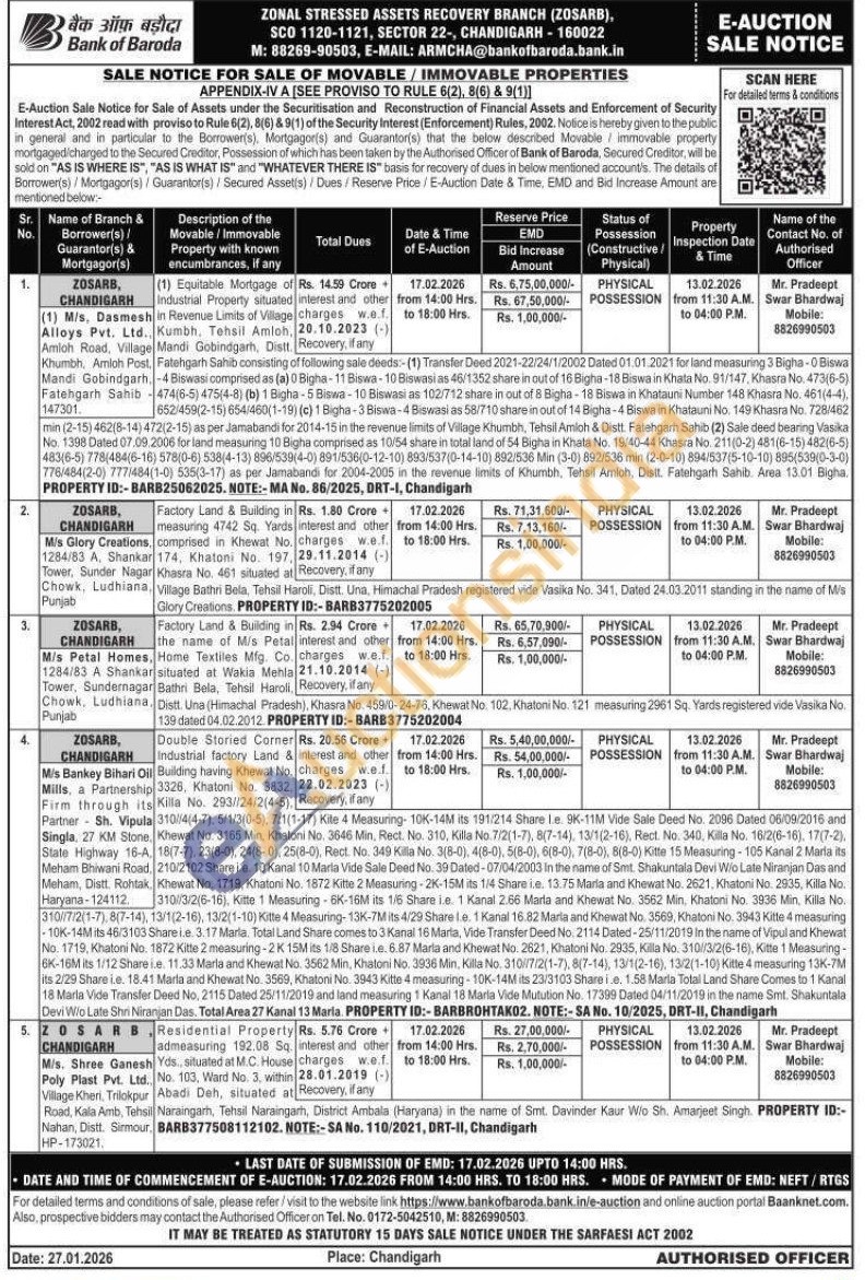 Double Storied Corner Industrial factory Land Building having Khewat No.3326, Khatoni No. 3832 Killa No. 293//24/2(4-5), 310/4(4-7), 5/1/3(0-5), 7/1(1-17) Kite 4 Measuring- 10K-14M its 191/214 Share le. 9K-11M Vide Sale Deed No. 2096 Dated 06/09/2016 and Khewat No. 3165 Min, Khatoni No. 3646 Min, Rect. No. 310, Killa No. 7/2(1-7), 8(7-14), 13/1(2-16), Rect. No. 340, Killa No. 16/2(6-16), 17(7-2),18(7-7), 23(8-0), 24(8-0), 25(8-0), Rect. No. 349 Killa No. 3(8-0), 4(8-0), 5(8-0), 6(8-0), 7(8-0), 8(8-0) Kitte 15 Measuring-105 Kanal 2 Marla its 210/2102 Share i.e. 10 Kanal 10 Marla Vide Sale Deed No. 39 Dated-07/04/2003 In the name of Smt. Shakuntala Devi W/o Late Niranjan Das and Khewat No. 1719, Khatoni No. 1872 Kitte 2 Measuring-2K-15M its 1/4 Share i.e. 13.75 Marla and Khewat No. 2621, Khatoni No. 2935, Killa. No. 310/3/2(6-16), Kitte 1 Measuring-6K-16M its 1/6 Share i.e. 1 Kanal 2.66 Marla and Khewat No. 3562 Min. Khatoni No. 3936 Min, Killa No.310/7/2(1-7),8(7-14), 13/1(2-16), 13/2(1-10) Kitte 4 Measuring-13K-7M its 4/29 Share le. 1 Kanal 16.82 Maria and Khewat No. 3569, Khatoni No. 3943 Kitte 4 measuring -10K-14M its 46/3103 Sharei.e. 3.17 Marla. Total Land Share comes to 3 Kanal 16 Maria, Vide Transfer Deed No. 2114 Dated-25/11/2019 In the name of Vipul and Khewat No. 1719, Khatoni No. 1872 Kitte 2 measuring-2K 15M its 1/8 Share i.e. 6.87 Marla and Khewat No. 2621, Khatoni No. 2935, Killa No. 310//3/2(6-16), Kitte 1 Measuring-6K-16M its 1/12 Share i.e. 11.33 Marla and Khewat No. 3562 Min, Khatoni No. 3936 Min, Killa No. 310/7/2(1-7), 8(7-14), 13/1(2-16), 13/2(1-10) Kitte 4 measuring 13K-7M its 2/29 Share i.e. 18.41 Marla and Khewat No. 3569, Khatoni No. 3943 Kitte 4 measuring-10K-14M its 23/3103 Share i.e. 1.58 Marla Total Land Share Comes to 1 Kanal 18 Marla Vide Transfer Deed No, 2115 Dated 25/11/2019 and land measuring 1 Kanal 18 Marla Vide Mutution No. 17399 Dated 04/11/2019 in the name Smt. Shakuntala Devi Wo Late Shri Niranjan Das. Total Area 27 Kanal 13 Maria. PROPERTY ID:- BARBROHTAK02. NOTE:- SA No. 10/2025, DRT-II, Chandigarh
