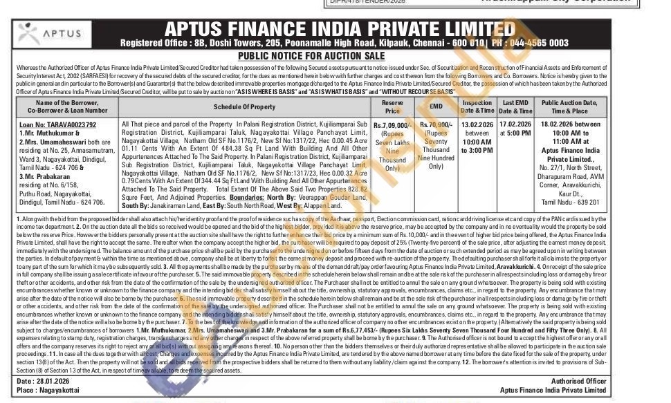 All That piece and parcel of the Property In Palani Registration District, Kujiliamparai Sub Registration District, Kujiliamparai Taluk, Nagayakottai Village Panchayat Limit, Nagayakottai Village, Natham Old SF No.1176/2, New Sf No:1317/22, Hec 0.00.45 Acre 01.11 Cents With An Extent Of 484.38 Sq Ft Land With Building And All Other Appurtenances Attached To The Said Property. In Palani Registration District, Kujiliamparai Sub Registration District, Kujiliamparai Taluk, Nagayakottai Village Panchayat Limit, Nagayakottai Village, Natham Old SF No.1176/2, New Sf No: 1317/23, Hec 0.00.32 Acre 0.79 Cents With An Extent Of 344.44 Sq Ft Land With Building And All Other Appurtenances Attached To The Said Property, Total Extent Of The Above Said Two Properties 828.82 Squre Feet, And Adjoined Properties. Boundaries: North By: Veerappan Goudar Land, South By: Janakiraman Land, East By: South North Road, West By: Alappan Land,