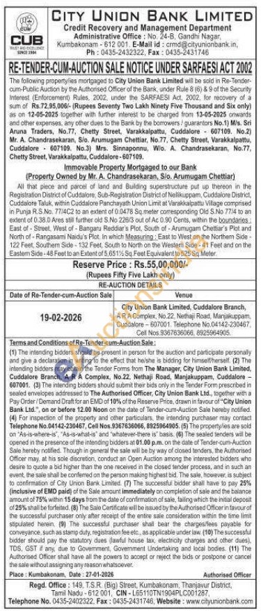 Immovable Property Mortgaged to our Bank (Property Owned by Mr. A. Chandrasekaran, S/o. Arumugam Chettiar) : All that piece and parcel of land and Building superstructure put up thereon in the Registration District of Cuddalore, Sub-Registration District of Nelikuppam, Cuddalore District, Cuddalore Taluk, within Cuddalore Panchayath Union Limit at Varakkalpattu Village comprised in Punja R.S.No. 77/4C2 to an extent of 0.0478 Sq.meter corresponding Old S.No 77/4 to an extent of 0.38.0 Ares still further old S.No 226/3 out of Ac 0.90 Cents, within the boundaries East of Street, West of - Bangaru Reddiar's Plot, South of - Arumugam Chettiar's Plot and North of - Rangasami Naidu's Plot. In which Measuring: East to West on the Northem Side -122 Feet, Southern Side-132 Feet, South to North on the Western Side-41 Feet and on the Eastem Side-48 Feet to an Extent of 5,651% Sq. Feet Equivalent to 525 Sq Meter