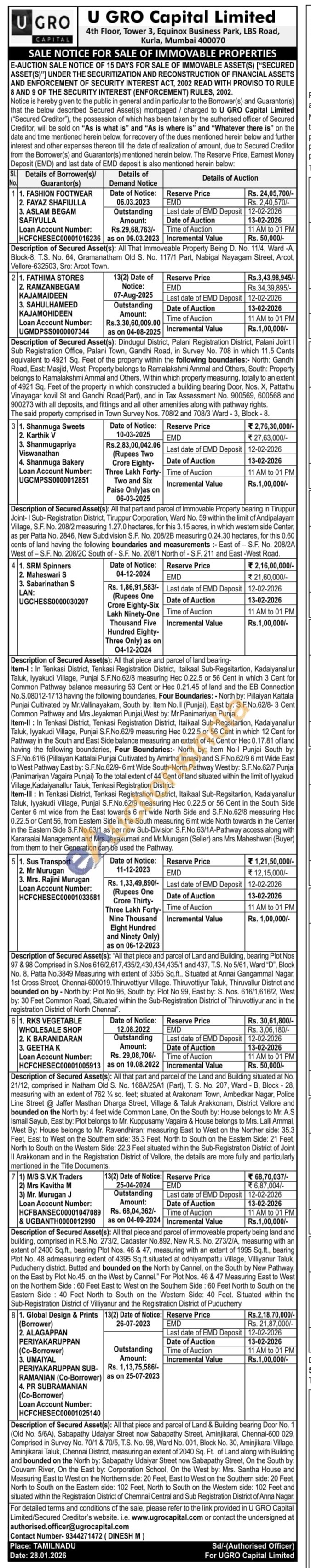 Description of Secured Asset(s): Dindugul District, Palani Registration District, Palani Joint I Sub Registration Office, Palani Town, Gandhi Road, in Survey No. 708 in which 11.5 Cents equivalent to 4921 Sq. Feet of the property within the following boundaries:- North: Gandhi Road, East: Masjid, West: Property belongs to Ramalakshmi Ammal and Others, South: Property belongs to Ramalakshmi Ammal and Others, Within which property measuring, totally to an extent of 4921 Sq. Feet of the property in which constructed a building bearing Door, Nos. X, Pattathu Vinayagar kovil St and Gandhi Road(Part), and in Tax Assessment No. 900569, 600568 and 900273 with all deposits, and fittings and all other amenities along with pathway rights.