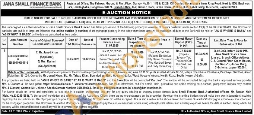 Details of Secured Assets: All that piece and parcel of the immovable property being House of Admeasuring Area 97.11 Sq yards situated at Patta No.50, Village Chandbass, Chirkhana, Panchayat Sainthel, Alwar, Rajasthan-321024. Owned by Mr. Juned Khan, S/o. Mr. Taiyab Khan. Bounded as: East: House of Gafflur, West: House of Ajeena, North: Road, South: House of Gaffur