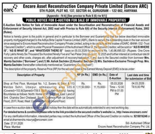 Shop at First Floor, Municipal No. 1-2, Surano Ki Sehn & 113 Maldas Sehri, Udaipur, admeasuring area 555.9 (Covered) 153.9(Opened)-709.5 Sq Ft. (Hall Balcony) having Boundaries as follows: North: Home of Sh. Indrawat, East: Land of Smt. Chandra Devi Cholawat, South: Common Path (at Ground Floor), 20 FL. Road, West Common Path (at Ground Floor)