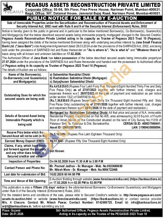 Mortgaged by: Rashidaben Salimbhai Dhobi: All that price and parcel of N.A. immovable Residential Property Constructed on Flat No.405, area ad measuring 32.05 Sq.mtr. of Fourth Floor of Aman Manzil on the Constructed situated on the land of City Survey No.11318 of Palanpur Sim, Ta. Palanpur & Dist. Banaskantha.