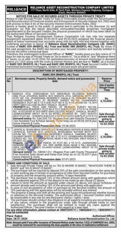 BARAIYA ATUL GIRISHABHAI S/O GIRISHBHAI RAJAVBHAI BARAIYA AND PUJA ATULBHAI BARIYA W/O BARAIYA ATUL GIRISBHAI BOTH RIO PLOT NO 130 JIVANDHARA RESIDENCY, HADALA TA TANKARA RAJKOT GUJARAT-360001 ALSO AT REVENUE SURVEY NO 169 JIVANDHARA RESIDENCY PLOT NO 4 TO 9 SUR PLOT NO 4 TO 9/14, HOUSE ND 14, B/H ARRIT ENGI COLLEGE RAJKOT HADALA RAJKOT PROPERTY ALL PIECE AND PARCEL OF REVENUE SERVEY NO 169, JIVANOHARA RESIDENCE PLOT NO 4 TO SUB PLOT NO 4 TO 9/14, HOUSE NO 14 SITUATED AT BIH ARPIT ENGI COLLEGE RALIKOT HADALA RAJKOT (ADMEASURING ABOUT 55-78 SQ MITRS BOUNDED BY EAST RAASTA WEST PLOT NO. 19 NORTH SUB PLOT 4 TO 9/13 SOUTH SUB PLOT 4 TO 9/15