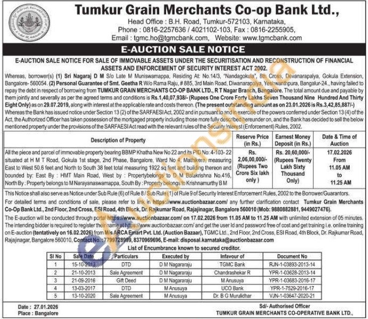 All the piece and parcel of immovable property bearing BBMP Khatha New No 22 and its PID No: 4-103-22 situated at HMT Road, Gokula 1st stage, 2nd Phase, Bangalore, Ward No 4, Mathikere, measuring East to West 50.6 feet and North to South 38 feet total measuring 1922 sq feet and building thereon and bounded by: East By HMT Main Road, West by Propertybelongs to D M Balakrishna No.416, North By: Property belongs to M Narayanaswamappa, South By: Property belongs to Krishnamurthy BM