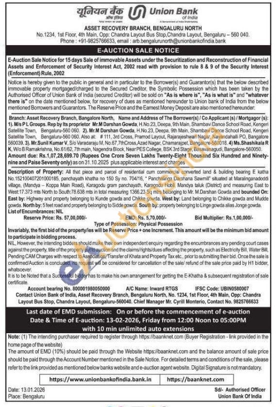 Description of Property: All that piece and parcel of residential cum commercial converted land & building bearing E katha No. 152100407201000185, panchayath khatha no 150 Sy no. 704/16, Panchalinga Darshana Sawmill situated at Maralinganadoddi village, (Mandya Koppa Main Road), Karagodu gram panchayath, Karagodu Hobli, Mandya taluk (District) and measuing East to West: 17.373 mts North to South: 78.638 mts in total measuring 1366.23 Sq mtrs belonging to Mr. M.Darshan Gowda and bounded On: East by: Highway and property belonging to Kunde gowda and Chikke gowda. West by: Land belonging to Chikke gowda and Mudde gowda. North by: 5 feet road and property belonging to Sidde gowda. South by: property belonging to Linge gowda alias Jonge gowda.