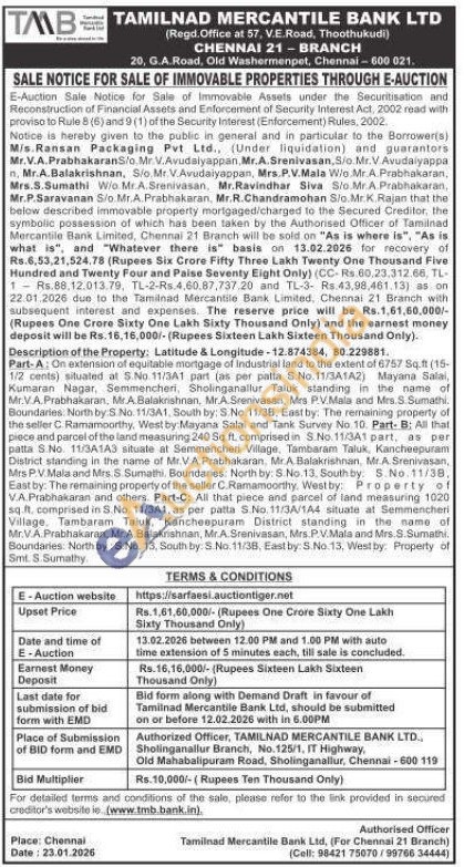 Part-A: On extension of equitable mortgage of industrial land to the extent of 6757 Sq.ft (15-1/2 cents) situated at S.No. 11/3A1 part (as per palta S.No.11/3A1A2) Mayana Salai, Kumaran Nagar, Semmencheri, Sholinganallur Taluk standing in the name of Mr.V.A. Prabhakaran, Mr.A.Balakrishnan, Mr.A. Srenivasan, Mrs P.V.Mala and Mrs. S. Sumathi. Boundaries. North by S. No. 11/3A1, South by: S.No. 11/38. East by: The remaining property of the seller C. Ramamoorthy, West by: Mayana Salai and Tank Survey No. 10. Part- B; All that piece and parcel of the land measuring 240 Sq.ft. comprised in S.No. 11/3A1 part, as per patta S.No. 11/3A1A3 situate at Semmencheri Village, Tambaram Taluk, Kancheepuram District standing in the name of Mr.V.A.Prabhakaran, Mr.A. Balakrishnan, Mr. A. Srenivasan, Mrs P.V.Mala and Mrs. S. Sumathi. Boundaries: North by: S.No.13. South by: S.No.11/38, East by: The remaining property of the seller C. Ramamoorthy, Westby: Property of V.A. Prabhakaran and others. Part-C: All that piece and parcel of land measuring 1020 sq.ft. comprised in S.No. 11/3A1, as per patta S.No. 11/3A/1A4 situate at Semmencheri Village, Tambaram Taluk, Kancheepuram District standing in the name of Mr.V.A.Prabhakaran, Mr.A.Balakrishnan, Mr.A. Srenivasan, Mrs.P.V.Mala and Mrs.S.Sumathi. Boundaries: North by: S.No. 13, South by: S.No. 11/3B, East by: S.No. 13, West by: Property of Smt. S. Sumathy
