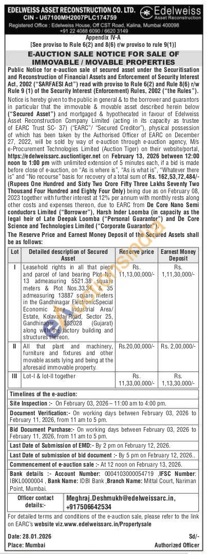 1 Leasehold rights in all that piece and parcel of land bearing Plot No. 13 admeasuring 5521.38 square meters & Plot Nos.33,34, & 35 admeasuring 13887 square meters. in the Gandhinagar ElectronicSpecial Economic Zone Industrial Area/Estate, Kolavada Road, Sector 25, Gandhinagar 382028 (Gujarat) along with the factory building and structures thereon,