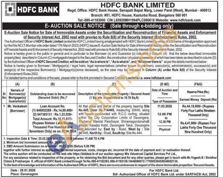 All that piece and parcel of the property bearing Site No.445, Door No.714/445, measuring 30X40, along with house constructed with R.C.C roofing, situated within the City Corporation Limits of Davangere, Shabanur Mandal Panchayat, Shiramagondanahalli Village, Kasaba Hobli, Davangere Taluk, Davangere and bounded by: East by Road, West by: Site No.446, North by: Road, South by: Site No.444.