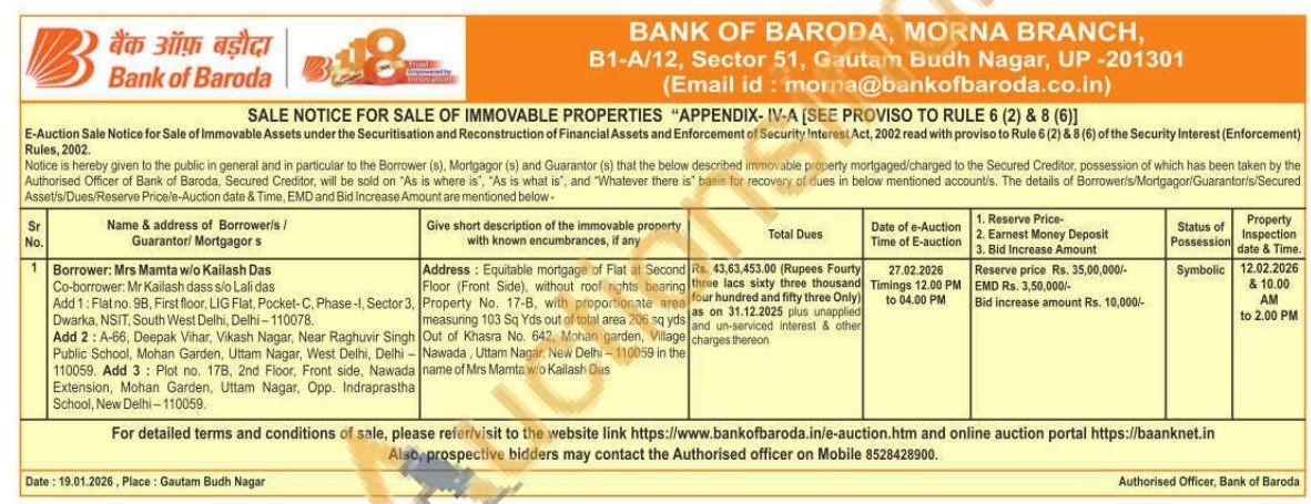 Address: Equitable mortgage of Flat at Second Floor (Front Side), without roof rights bearing Property No. 17-B, with proportionate area measuring 103 Sq Yds out of total area 206 sq yds Out of Khasra No. 642, Mohan garden, Village Nawada, Uttam Nagar, New Delhi-110059 in the name of Mrs Mamta w/o Kailash Das