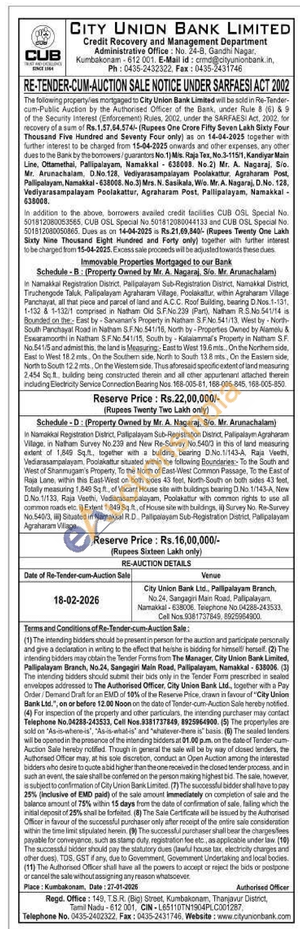 In Namakkal Registration District, Pallipalayam Sub-Registration District, Namakkal District, Tiruchengade Taluk. Palipalayam Agraharam Village, Poolakattur, within Agraharam Village Panchayat, all that piece and parcel of land and A.C.C. Roof Building, bearing D.Nos.1-131, 1-132 & 1-132/1 comprised in Natham Old S.F.No.239 (Part), Natham R.S.No.541/14 is Bounded on the East by- Sarvanan's Property in Natham S.F.No.541/13, West by North-South Panchayat Road in Natham S.F.No.541/16, North by-Properties Owned by Alamelu & Eswaramoorthi in Natham S.F.No.541/15, South by Kalalammal's Property in Natham S.F. No.541/5 and admist this, the land is Measuring:- East to West 19.6 mls., On the Northem side, East to West 18.2 mts. On the Southern side, North to South 13.8 mts., On the Eastern side, North to South 12.2 mts. On the Western side, Thus aforesaid specific extent of land measuring 2,454 Sq.ft., building being constructed therein and all other appurtenant attached therein including Electricity Service Connection Bearing Nos. 168-005-81, 188-005-845, 168-005-850.