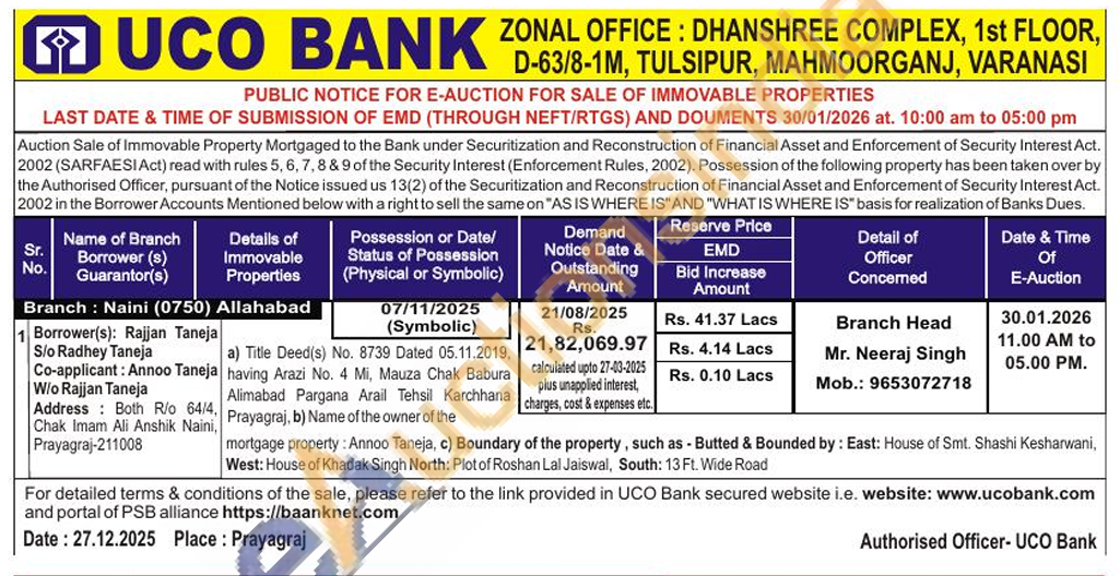 a) Title Deed(s) No. 8739 Dated 05.11.2019, having Arazi No. 4 Mi, Mauza Chak Babura Alimabad Pargana Arail Tehsil Karchhana Prayagraj, b) Name of the owner of the mortgage property: Annoo Taneja, c) Boundary of the property, such as - Butted & Bounded by: East: House of Smt. Shashi Kesharwani, West: House of Khadak Singh North: Plot of Roshan Lal Jaiswal, South: 13 Ft. Wide Road