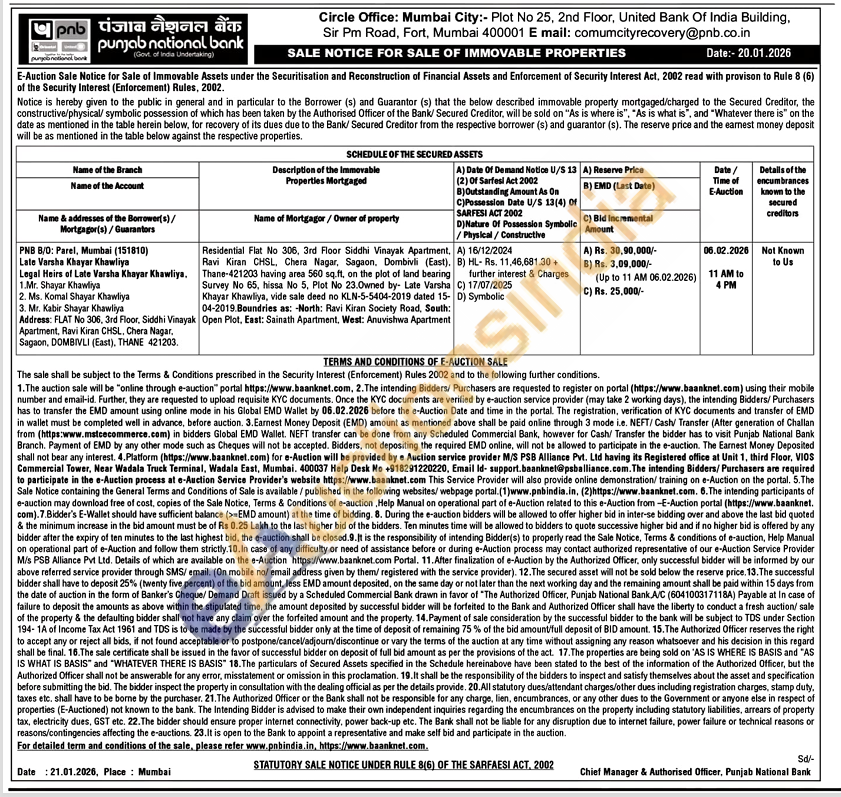 Residential Flat No 306, 3rd Floor Siddhi Vinayak Apartment, Ravi Kiran CHSL, Chera Nagar, Sagaon, Dombivli (East), Thane-421203 having area 560 sq.ft, on the plot of land bearing Survey No 65, hissa No 5, Plot No 23.Owned by Late Varsha Khayar Khawliya, vide sale deed no KLN-5-5404-2019 dated 15-04-2019.Boundries as: -North: Ravi Kiran Society Road, South: Open Plot, East: Sainath Apartment, West: Anuvishwa Apartment