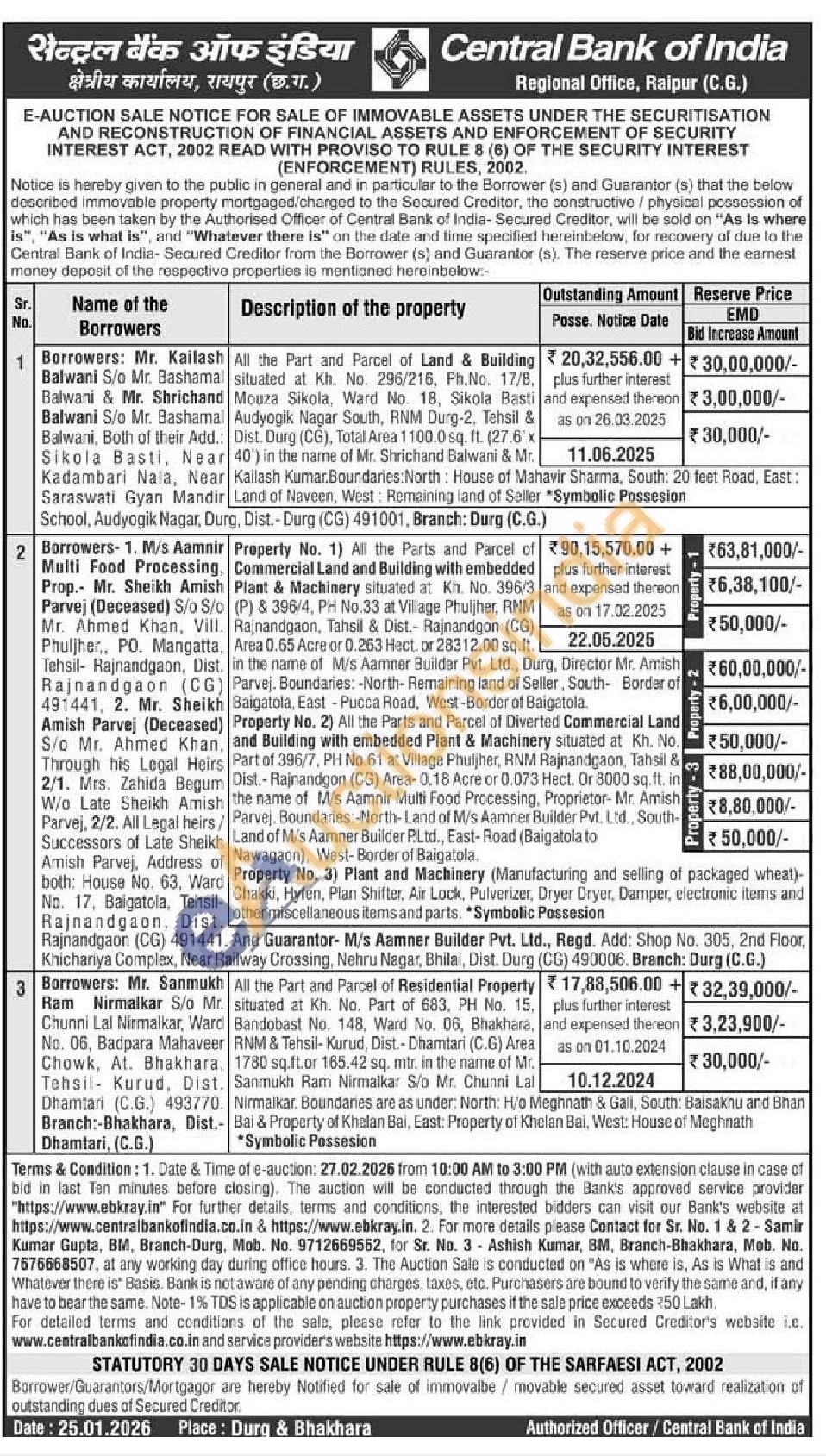 Property No. 3) Plant and Machinery (Manufacturing and selling of packaged wheat)-Chakki, Hyfen, Plan Shifter, Air Lock, Pulverizer, Dryer Dryer, Damper, electronic items and other miscellaneous items and parts. Symbolic Possesion