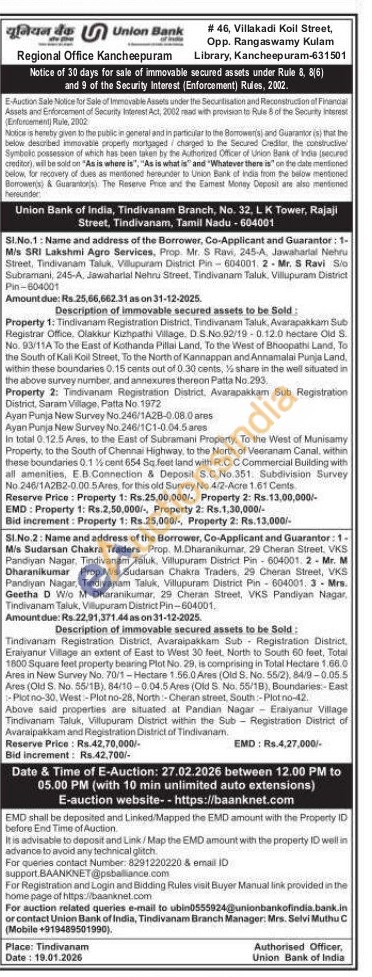 Property 2: Tindivanam Registration District, Avarapakkam Sub Registration District, Saram Village, Patta No. 1972 Ayan Punja New Survey No.246/1A28-0.08.0 ares Ayan Punja Now Survey No.246/1C1-0.04.5 ares In total 0. 12.5 Ares, to the East of Subramani Property, To the West of Munisamy Property, to the South of Chennal Highway, to the North of Veeranam Canal, within these boundaries 0.1% cant 654 Sq feet land with R.C.C Commercial Building with all amenities, E.B.Connection & Deposit S.C.No.351. Subdivision Survey No. 246/1A282-0.00.5 Ares, for this old Survey No 4/2-Acre 1.61 Cents