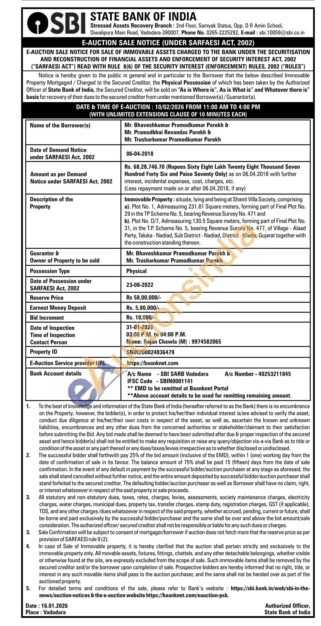 Immovable Property: situate, lying and being at Shanti Villa Society, comprising a). Plot No. 1, Admeasuring 231.81 Square meters, forming part of Final Plot No. 29 in the TP Scheme No. 5, bearing Revenue Survey No. 471 and b). Plot No. 0/7, Admeasuring 130.5 Square meters, forming part of Final Plot No. 31, in the T.P. Scheme No. 5, bearing Revenue Survey No. 477, of Village-Alaad Party, Taluka-Nadiad, Sub District-Nadiad, District-Kheda, Gujarat together with the construction standing thereon.