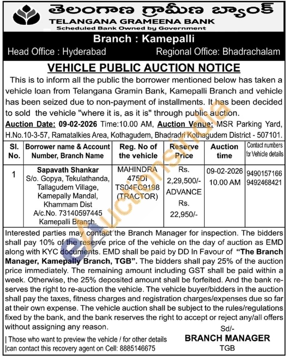 Reg. No of the vehicle : MAHINDRA 475DI TS04FC9198 (TRACTOR)