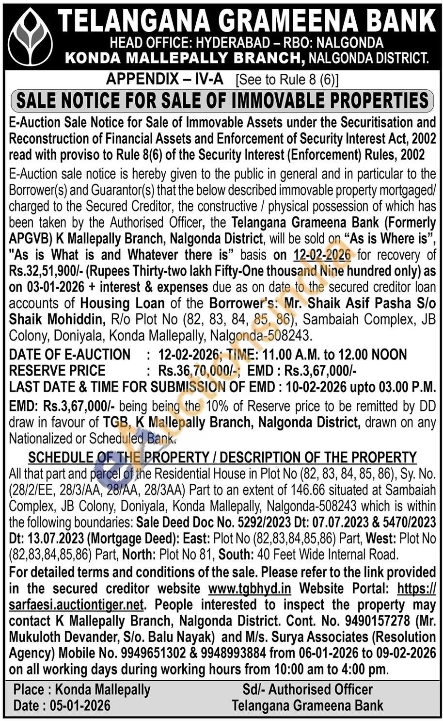 All that part and parcel of the Residential House in Plot No (82, 83, 84, 85, 86), Sy. No. (28/2/ΕΕ, 28/3/AA, 28/AA, 28/3AA) Part to an extent of 146.66 situated at Sambaiah Complex, JB Colony, Doniyala, Konda Mallepally, Nalgonda-508243 which is within the following boundaries: Sale Deed Doc No. 5292/2023 Dt: 07.07.2023 & 5470/2023 Dt: 13.07.2023 (Mortgage Deed): East: Plot No (82,83,84,85,86) Part, West: Plot No (82,83,84,85,86) Part, North: Plot No 81, South: 40 Feet Wide Internal Road.