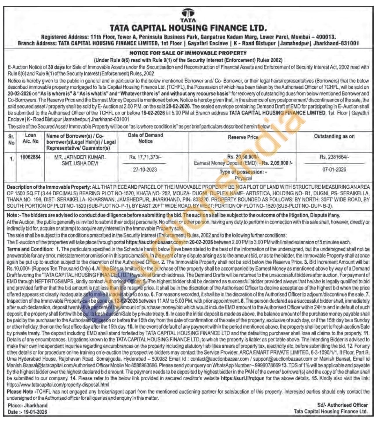ALL THAT PIECE AND PARCEL OF THE IMMOVABLE PROPERTY BEING APLOT OF LAND WITH STRUCTURE MEASURING AN AREA OF 1500 SQ.FT.(3.44 DECIMALS) BEARING PLOT NO-1520, KHATA NO-252, MOUZA-DUGNI, DUPLEX NAME-ARTISTICA, HOLDING NO-81, DUGNI, PS-SERAIKELLA, THANA NO-199, DIST-SERAIKELLA KHARSWAN, JAMSHEDPUR, JHARKHAND, PIN-833220. PROPERTY BOUNDED AS FOLLOWS: BY NORTH: 30FT WIDE ROAD, BY SOUTH: PORTION OF PLOT NO-1520 (SUB-PLOTNO-P-1), BY EAST 20FT WIDE ROAD, BY WEST: PORTION OF PLOT NO-1520 (SUB-PLOTNO-DUP-B-3)