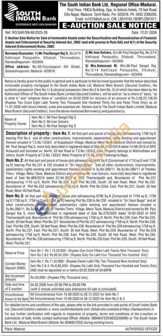 Item No.2: All that part and parcel of house plot admeasuring 3440 Sq.ft (Comprised of 1710 sq.ft and 1730 sq.ft) bearing Plot No.231 & 232 situated in "Sri Vipul Nagar and all other constructions, improvements, easementary rights existing and appurtenant thereon situated in Sy.No.266/11, Re. Sy No.266/11 of Therkku Theru Village, Melur Taluk, Madurai District and owned by Mr. Ivan Solvaro, more fully described in registered deed of Sale No.860/2019 dated 22-04-2019 of SRO Thamaraipatti and, Boundaries of Plot No.231 admeasuring 1710 sq.ft, North: Plot No.234, East: Plot No.230, South: 30 feet Road, West: Plot No.232. Boundaries of Plot No.232 admeasuring 1730 sq.ft, North: Plot No.233A, East: Plot No 231, South: 30 feet Road, West: 40 Feet Road