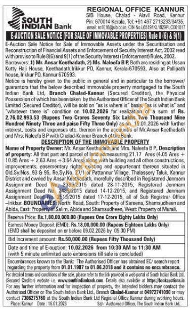 All that part and parcel of land admeasuring 21.17 Ares (4.05 Ares + 10.85 Ares + 2.63 Ares +3.54 Ares) along with building and all other constructions, improvements, easementary rights existing and appurtenant thereon situated in Old Sy Nos. 93 & 95, Re.Sy.No. 27/1 of Pattannur Village, Thalassery Taluk, Kannur District and owned by Ansar Keethadath, morefully described in Registered Jenmam Assignment Deed No. 2389/2015 dated 28-11-2015, Registered Jenmam Assignment Deed No. 2485/2015 dated 14-12-2015, and Registered Jenmam Assignment Deed No. 2513/2015 dated 17-12-2015, all of Sub Registrar Office -Irikkur, BOUNDARIES: North: Road, South: Property of Sareena, Shamsudheen and Abida, East: Property of Salim, Abida and Shamsudheen, West: Property of Murak.