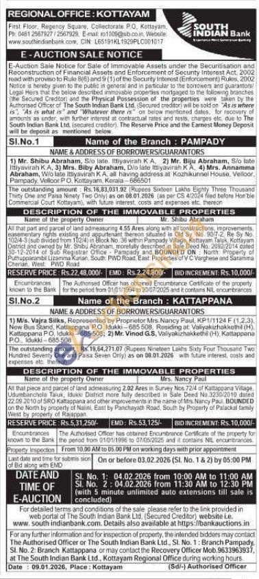 1) All that part and parcel of land admeasuring 4.55 Ares along with all constructions, improvements easementary rights existing and appurtenant thereon situated in Old Sy No. 90/7-2. Re Sy No. 1024-3 (sub divided from 1024) in Block No. 36 within Pampady Vilage, Kottayam Taluk, Kottayam District and owned by Mr. Shibu Abraham, morefully described in Sale Deed No. 2012-2014 cated 30-12-2014 of Sub Registrar Office Pas Sub Registrar Office Pampady and BOUNDED ON: North Property of Puthupparambil Lizamma Kunan, South PWD Road East Properties of VC Varghese and Saramma Cherian, West: PWD Road