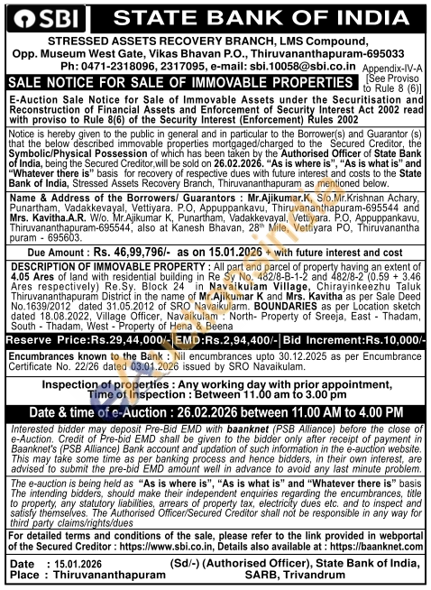 All part and parcel of property having an extent of 4.05 Ares of land with residential building in Re Sy No. 482/8-8-1-2 and 482/8-2 (0.59 +3.46 Ares respectively) Re.Sy. Block 24 in Navaikulam Village, Chirayinkeezhu Taluk Thiruvananthapuram District in the name of Mr.Ajikumar K and Mrs. Kavitha as per Sale Deed No.1639/2012 dated 31.05.2012 of SRO Navaikularm. BOUNDARIES as per Location sketch dated 18.08.2022, Village Officer, Navaikulam North Property of Sreeja, East - Thadam, South Thadam, West Property of Hena & Beena
