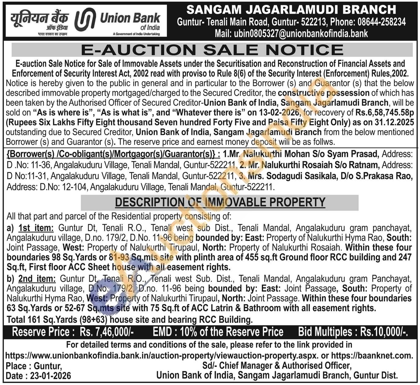 All that part and parcel of the Residential property consisting of: a) 1st item: Guntur Dt, Tenali R.O., Tenali west sub Dist., Tenali Mandal, Angalakuduru gram panchayat, Angalakuduru village, D.no. 179/2, D.No. 11-96 being bounded by: East: Property of Nalukurthi Hyma Rao, South: Joint Passage, West: Property of Nalukurthi Tirupaul, North: Property of Nalukurthi Rosaiah. Within these four boundaries 98 Sq. Yards or 81-93 Sq.mts site with plinth area of 455 sq.ft Ground floor RCC building and 247 Sq.ft, First floor ACC Sheet house with all easement rights. b) 2nd item: Guntur Dt, Tenali R.O., Tenali west Sub. Dist., Tenali Mandal, Angalakuduru gram Panchayat, Angalakuduru village, D.No. 179/2, D.no. 11-96 being bounded by: East: Joint Passage, South: Property of Nalukurthi Hyma Rao, West: Property of Nalukurthi Tirupaul, North: Joint Passage. Within these four boundaries 63 Sq. Yards or 52-67 Sq.mts site with 75 Sq.ft of ACC Latrin & Bathroom with all easement rights. Total 161 Sq. Yards (98+63) house site and bearing RCC Building.